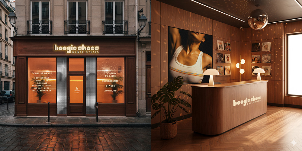Le secteur du fitness et de la danse est souvent saturé d’identités froides, minimalistes à l’excès ou purement fonctionnelles. Pour Boogie Shoes Studio, l’enjeu était de briser ces codes en créant un « 3ème lieu » hybride : un studio de danse qui soit autant un espace de performance qu’un sanctuaire lifestyle. L’objectif était de concevoir une marque capable de générer une adhésion immédiate, en misant sur l’émotion et la nostalgie d’une époque où la danse était synonyme de libération : les années 70.